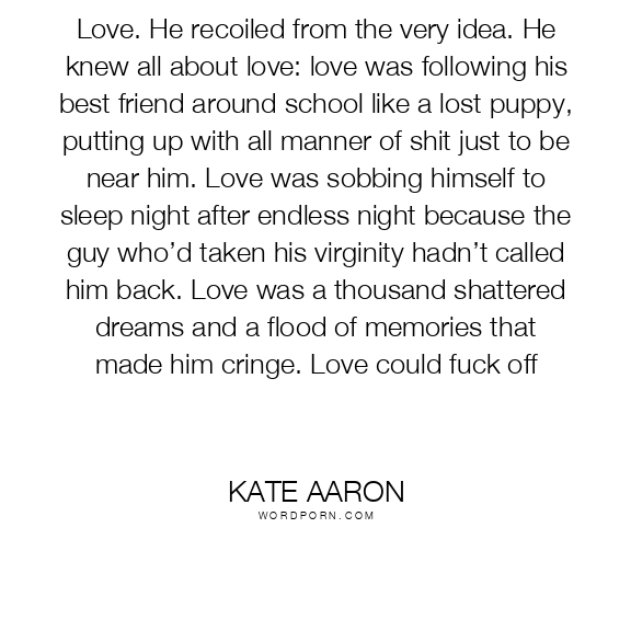 Love. He recoiled from the very idea. He knew all about love: love was following his best friend around school like a lost puppy, putting up with all manner of shit just to be near him. Love was sobbing himself to sleep night after endless night because the guy who’d taken his virginity hadn’t called him back. Love was a thousand shattered dreams and a flood of memories that made him cringe. Love could fuck off