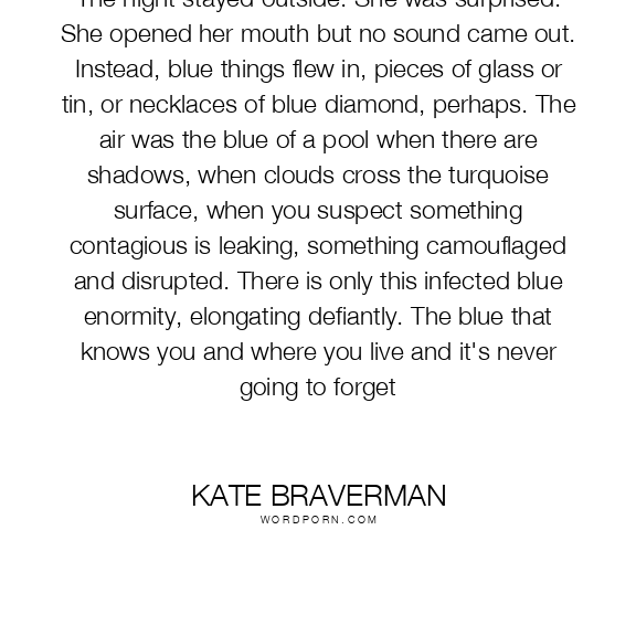 The night stayed outside. She was surprised. She opened her mouth but no sound came out. Instead, blue things flew in, pieces of glass or tin, or necklaces of blue diamond, perhaps. The air was the blue of a pool when there are shadows, when clouds cross the turquoise surface, when you suspect something contagious is leaking, something camouflaged and disrupted. There is only this infected blue enormity, elongating defiantly. The blue that knows you and where you live and it's never going to forget