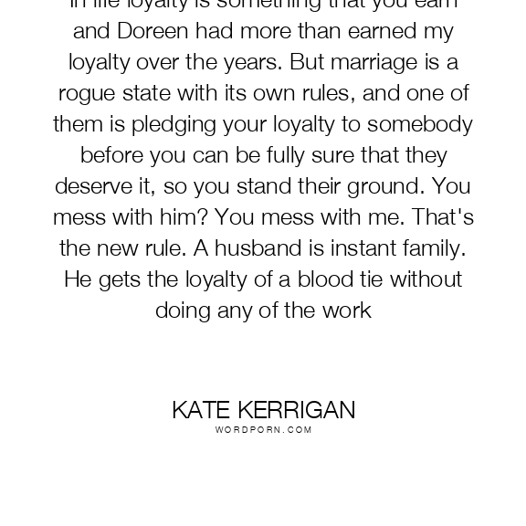 In life loyalty is something that you earn and Doreen had more than earned my loyalty over the years. But marriage is a rogue state with its own rules, and one of them is pledging your loyalty to somebody before you can be fully sure that they deserve it, so you stand their ground. You mess with him? You mess with me. That's the new rule. A husband is instant family. He gets the loyalty of a blood tie without doing any of the work