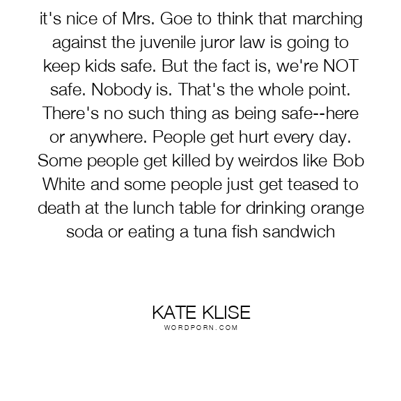 it's nice of Mrs. Goe to think that marching against the juvenile juror law is going to keep kids safe. But the fact is, we're NOT safe. Nobody is. That's the whole point. There's no such thing as being safe--here or anywhere. People get hurt every day. Some people get killed by weirdos like Bob White and some people just get teased to death at the lunch table for drinking orange soda or eating a tuna fish sandwich