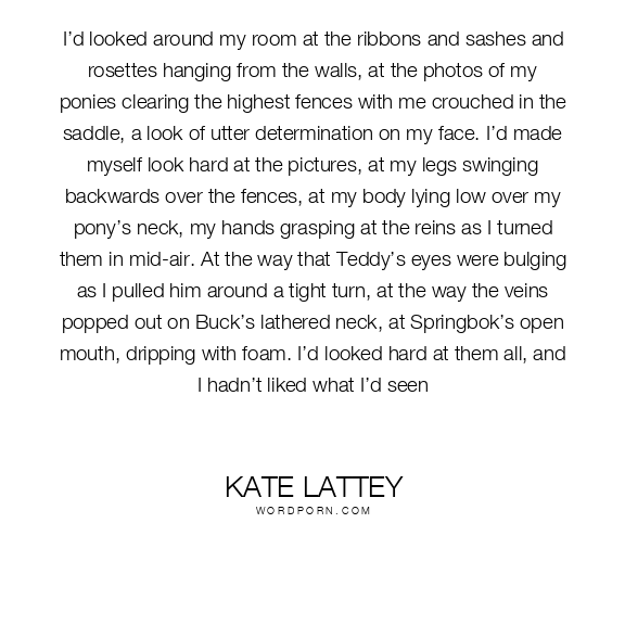 I’d looked around my room at the ribbons and sashes and rosettes hanging from the walls, at the photos of my ponies clearing the highest fences with me crouched in the saddle, a look of utter determination on my face. I’d made myself look hard at the pictures, at my legs swinging backwards over the fences, at my body lying low over my pony’s neck, my hands grasping at the reins as I turned them in mid-air. At the way that Teddy’s eyes were bulging as I pulled him around a tight turn, at the way the veins popped out on Buck’s lathered neck, at Springbok’s open mouth, dripping with foam. I’d looked hard at them all, and I hadn’t liked what I’d seen