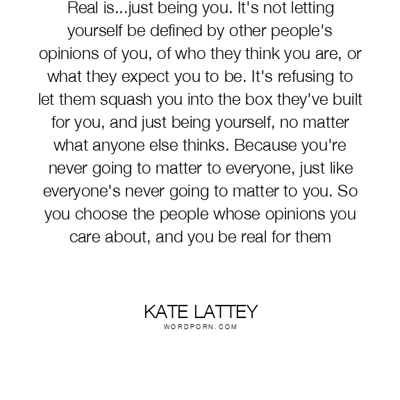 Real is...just being you. It's not letting yourself be defined by other people's opinions of you, of who they think you are, or what they expect you to be. It's refusing to let them squash you into the box they've built for you, and just being yourself, no matter what anyone else thinks. Because you're never going to matter to everyone, just like everyone's never going to matter to you. So you choose the people whose opinions you care about, and you be real for them
