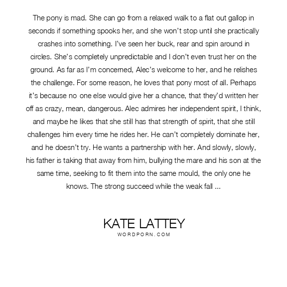 The pony is mad. She can go from a relaxed walk to a flat out gallop in seconds if something spooks her, and she won’t stop until she practically crashes into something. I’ve seen her buck, rear and spin around in circles. She’s completely unpredictable and I don’t even trust her on the ground. As far as I’m concerned, Alec’s welcome to her, and he relishes the challenge. For some reason, he loves that pony most of all. Perhaps it’s because no-one else would give her a chance, that they’d written her off as crazy, mean, dangerous. Alec admires her independent spirit, I think, and maybe he likes that she still has that strength of spirit, that she still challenges him every time he rides her. He can’t completely dominate her, and he doesn’t try. He wants a partnership with her. And slowly, slowly, his father is taking that away from him, bullying the mare and his son at the same time, seeking to fit them into the same mould, the only one he knows. The strong succeed while the weak fall behind