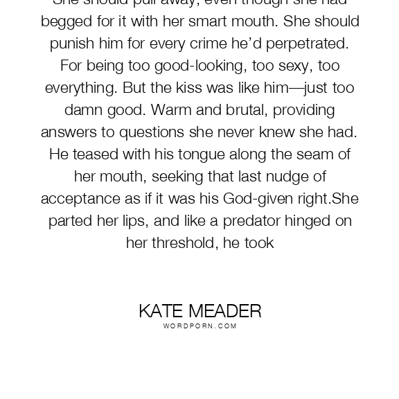 She should pull away, even though she had begged for it with her smart mouth. She should punish him for every crime he’d perpetrated. For being too good-looking, too sexy, too everything. But the kiss was like him—just too damn good. Warm and brutal, providing answers to questions she never knew she had. He teased with his tongue along the seam of her mouth, seeking that last nudge of acceptance as if it was his God-given right.She parted her lips, and like a predator hinged on her threshold, he took