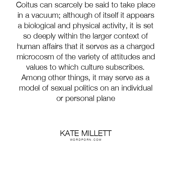 Coitus can scarcely be said to take place in a vacuum; although of itself it appears a biological and physical activity, it is set so deeply within the larger context of human affairs that it serves as a charged microcosm of the variety of attitudes and values to which culture subscribes. Among other things, it may serve as a model of sexual politics on an individual or personal plane