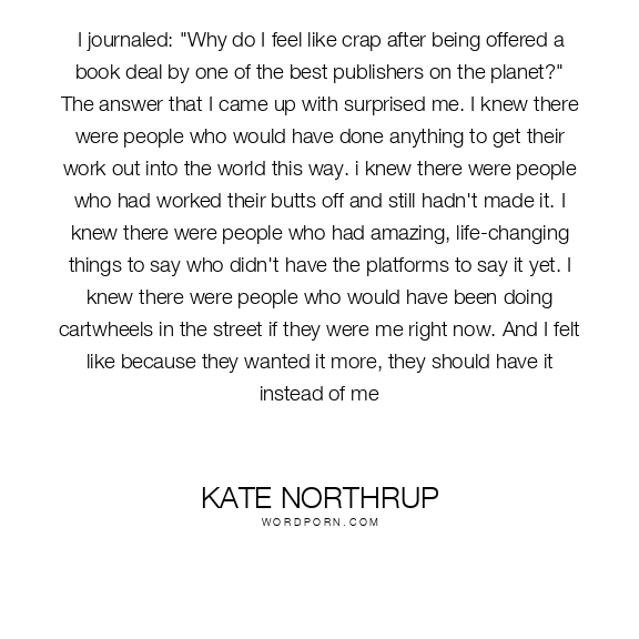 I journaled: "Why do I feel like crap after being offered a book deal by one of the best publishers on the planet?" The answer that I came up with surprised me. I knew there were people who would have done anything to get their work out into the world this way. i knew there were people who had worked their butts off and still hadn't made it. I knew there were people who had amazing, life-changing things to say who didn't have the platforms to say it yet. I knew there were people who would have been doing cartwheels in the street if they were me right now. And I felt like because they wanted it more, they should have it instead of me