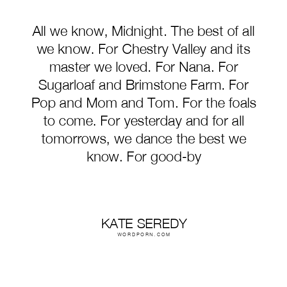 All we know, Midnight. The best of all we know. For Chestry Valley and its master we loved. For Nana. For Sugarloaf and Brimstone Farm. For Pop and Mom and Tom. For the foals to come. For yesterday and for all tomorrows, we dance the best we know. For good-by