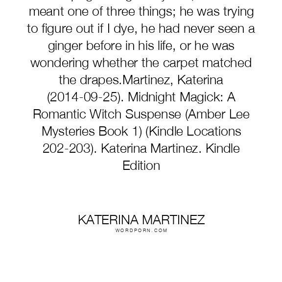 He kept glancing at my hair, and that meant one of three things; he was trying to figure out if I dye, he had never seen a ginger before in his life, or he was wondering whether the carpet matched the drapes.Martinez, Katerina (2014-09-25). Midnight Magick: A Romantic Witch Suspense (Amber Lee Mysteries Book 1) (Kindle Locations 202-203). Katerina Martinez. Kindle Edition