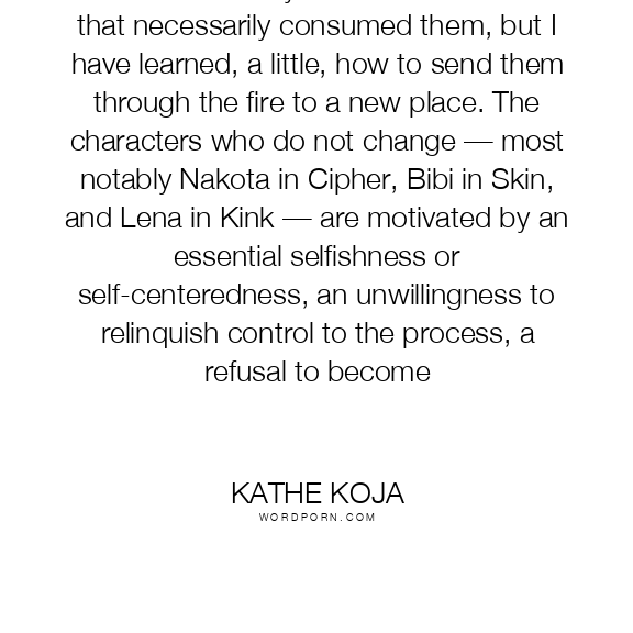 I used to send my characters into a fire that necessarily consumed them, but I have learned, a little, how to send them through the fire to a new place. The characters who do not change — most notably Nakota in Cipher, Bibi in Skin, and Lena in Kink — are motivated by an essential selfishness or self-centeredness, an unwillingness to relinquish control to the process, a refusal to become