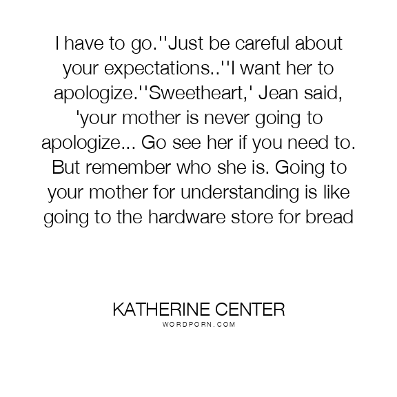 I have to go.''Just be careful about your expectations..''I want her to apologize.''Sweetheart,' Jean said, 'your mother is never going to apologize... Go see her if you need to. But remember who she is. Going to your mother for understanding is like going to the hardware store for bread