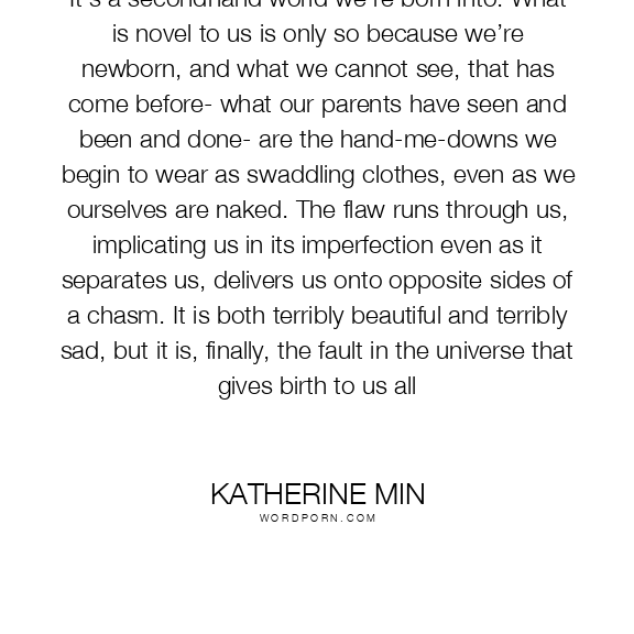 It’s a secondhand world we’re born into. What is novel to us is only so because we’re newborn, and what we cannot see, that has come before- what our parents have seen and been and done- are the hand-me-downs we begin to wear as swaddling clothes, even as we ourselves are naked. The flaw runs through us, implicating us in its imperfection even as it separates us, delivers us onto opposite sides of a chasm. It is both terribly beautiful and terribly sad, but it is, finally, the fault in the universe that gives birth to us all