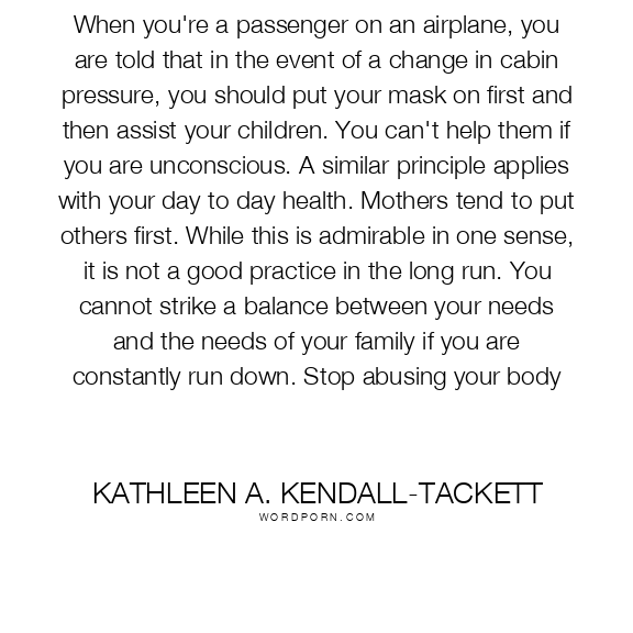 When you're a passenger on an airplane, you are told that in the event of a change in cabin pressure, you should put your mask on first and then assist your children. You can't help them if you are unconscious. A similar principle applies with your day to day health. Mothers tend to put others first. While this is admirable in one sense, it is not a good practice in the long run. You cannot strike a balance between your needs and the needs of your family if you are constantly run down. Stop abusing your body