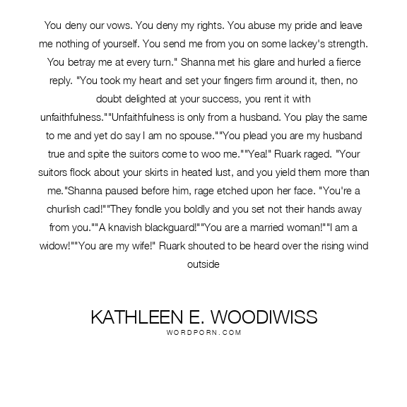 You deny our vows. You deny my rights. You abuse my pride and leave me nothing of yourself. You send me from you on some lackey's strength. You betray me at every turn." Shanna met his glare and hurled a fierce reply. "You took my heart and set your fingers firm around it, then, no doubt delighted at your success, you rent it with unfaithfulness.""Unfaithfulness is only from a husband. You play the same to me and yet do say I am no spouse.""You plead you are my husband true and spite the suitors come to woo me.""Yea!" Ruark raged. "Your suitors flock about your skirts in heated lust, and you yield them more than me."Shanna paused before him, rage etched upon her face. "You're a churlish cad!""They fondle you boldly and you set not their hands away from you.""A knavish blackguard!""You are a married woman!""I am a widow!""You are my wife!" Ruark shouted to be heard over the rising wind outside