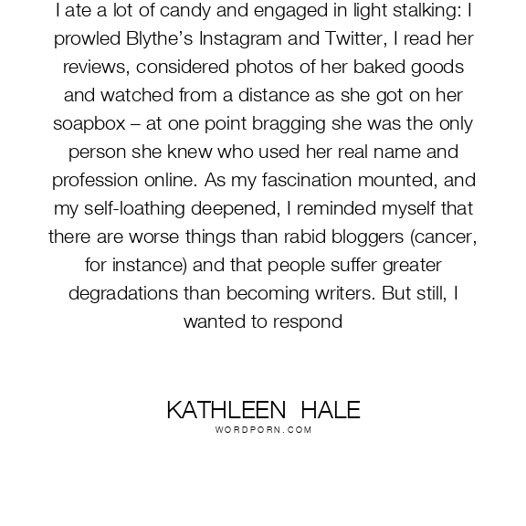 I ate a lot of candy and engaged in light stalking: I prowled Blythe’s Instagram and Twitter, I read her reviews, considered photos of her baked goods and watched from a distance as she got on her soapbox – at one point bragging she was the only person she knew who used her real name and profession online. As my fascination mounted, and my self-loathing deepened, I reminded myself that there are worse things than rabid bloggers (cancer, for instance) and that people suffer greater degradations than becoming writers. But still, I wanted to respond