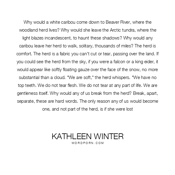 Why would a white caribou come down to Beaver River, where the woodland herd lives? Why would she leave the Arctic tundra, where the light blazes incandescent, to haunt these shadows? Why would any caribou leave her herd to walk, solitary, thousands of miles? The herd is comfort. The herd is a fabric you can't cut or tear, passing over the land. If you could see the herd from the sky, if you were a falcon or a king eider, it would appear like softly floating gauze over the face of the snow, no more substantial than a cloud. "We are soft," the herd whispers. "We have no top teeth. We do not tear flesh. We do not tear at any part of life. We are gentleness itself. Why would any of us break from the herd? Break, apart, separate, these are hard words. The only reason any of us would become one, and not part of the herd, is if she were lost