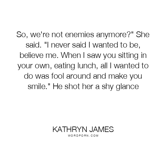 So, we're not enemies anymore?" She said. "I never said I wanted to be, believe me. When I saw you sitting in your own, eating lunch, all I wanted to do was fool around and make you smile." He shot her a shy glance
