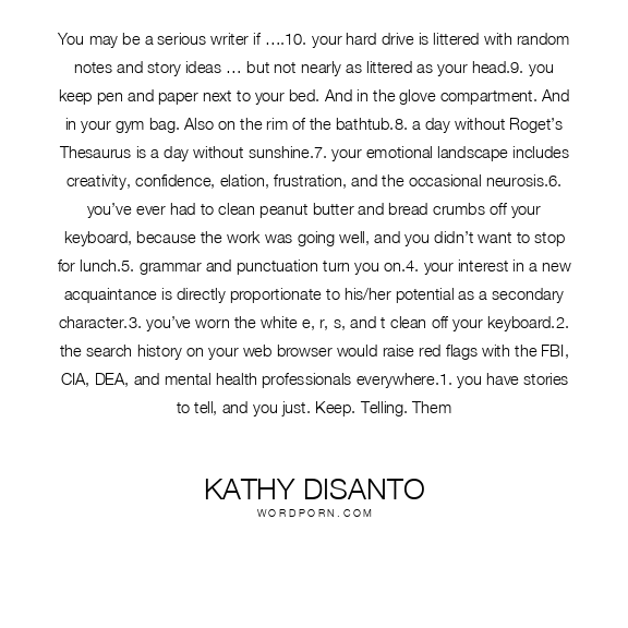 You may be a serious writer if ….10. your hard drive is littered with random notes and story ideas … but not nearly as littered as your head.9. you keep pen and paper next to your bed. And in the glove compartment. And in your gym bag. Also on the rim of the bathtub.8. a day without Roget’s Thesaurus is a day without sunshine.7. your emotional landscape includes creativity, confidence, elation, frustration, and the occasional neurosis.6. you’ve ever had to clean peanut butter and bread crumbs off your keyboard, because the work was going well, and you didn’t want to stop for lunch.5. grammar and punctuation turn you on.4. your interest in a new acquaintance is directly proportionate to his/her potential as a secondary character.3. you’ve worn the white e, r, s, and t clean off your keyboard.2. the search history on your web browser would raise red flags with the FBI, CIA, DEA, and mental health professionals everywhere.1. you have stories to tell, and you just. Keep. Telling. Them