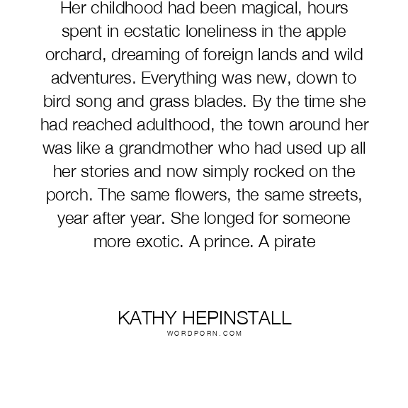 Her childhood had been magical, hours spent in ecstatic loneliness in the apple orchard, dreaming of foreign lands and wild adventures. Everything was new, down to bird song and grass blades. By the time she had reached adulthood, the town around her was like a grandmother who had used up all her stories and now simply rocked on the porch. The same flowers, the same streets, year after year. She longed for someone more exotic. A prince. A pirate