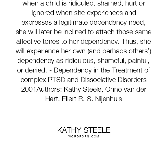 when a child is ridiculed, shamed, hurt or ignored when she experiences and expresses a legitimate dependency need, she will later be inclined to attach those same affective tones to her dependency. Thus, she will experience her own (and perhaps others’) dependency as ridiculous, shameful, painful, or denied. - Dependency in the Treatment of complex PTSD and Dissociative Disorders 2001Authors: Kathy Steele, Onno van der Hart, Ellert R. S. Nijenhuis
