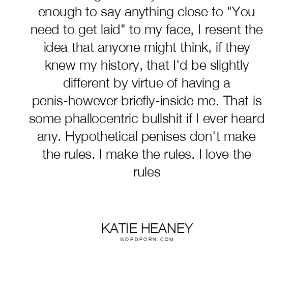 And though nobody has been dumb enough to say anything close to "You need to get laid" to my face, I resent the idea that anyone might think, if they knew my history, that I'd be slightly different by virtue of having a penis-however briefly-inside me. That is some phallocentric bullshit if I ever heard any. Hypothetical penises don't make the rules. I make the rules. I love the rules