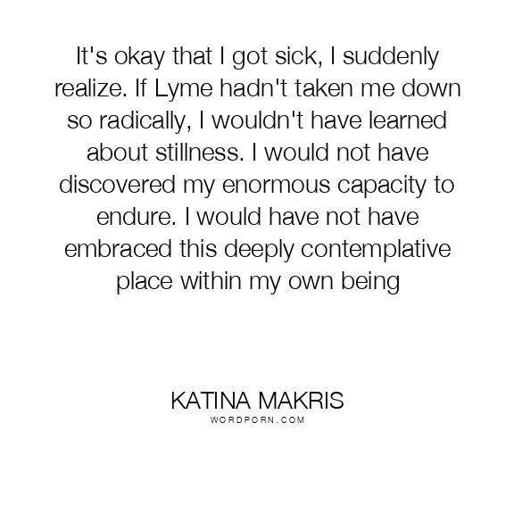 It's okay that I got sick, I suddenly realize. If Lyme hadn't taken me down so radically, I wouldn't have learned about stillness. I would not have discovered my enormous capacity to endure. I would have not have embraced this deeply contemplative place within my own being