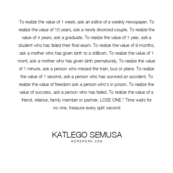 To realize the value of 1 week, ask an editor of a weekly newspaper. To realize the value of 10 years, ask a newly divorced couple. To realize the value of 4 years, ask a graduate. To realize the value of 1 year, ask a student who has failed their final exam. To realize the value of 9 months, ask a mother who has given birth to a stillborn. To realize the value of 1 mont, ask a mother who has given birth prematurely. To realize the value of 1 minute, ask a person who missed the train, bus or plane. To realize the value of 1 second, ask a person who has survived an accident. To realize the value of freedom ask a person who's in prison. To realize the value of success, ask a person who has failed. To realize the value of a friend, relative, family member or partner, LOSE ONE." Time waits for no-one, treasure every split-second