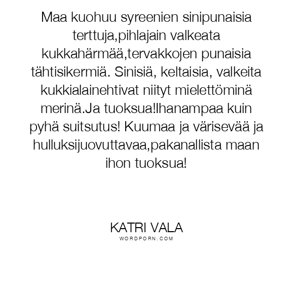 Maa kuohuu syreenien sinipunaisia terttuja,pihlajain valkeata kukkahärmää,tervakkojen punaisia tähtisikermiä. Sinisiä, keltaisia, valkeita kukkialainehtivat niityt mielettöminä merinä.Ja tuoksua!Ihanampaa kuin pyhä suitsutus! Kuumaa ja värisevää ja hulluksijuovuttavaa,pakanallista maan ihon tuoksua!