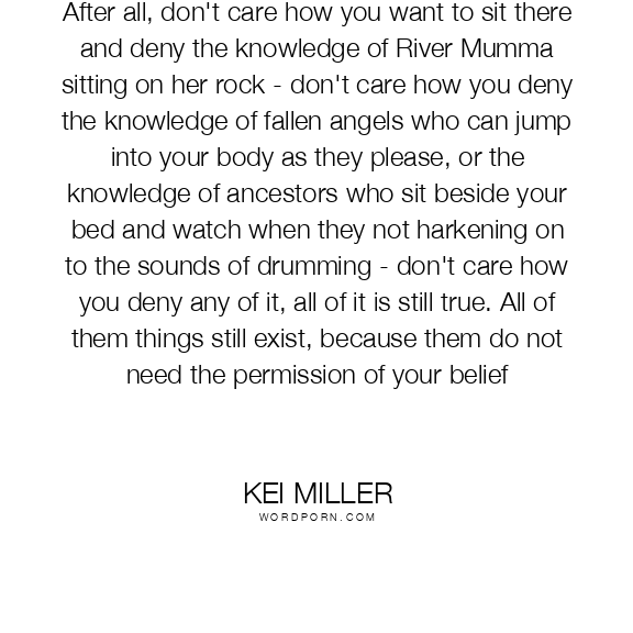 After all, don't care how you want to sit there and deny the knowledge of River Mumma sitting on her rock - don't care how you deny the knowledge of fallen angels who can jump into your body as they please, or the knowledge of ancestors who sit beside your bed and watch when they not harkening on to the sounds of drumming - don't care how you deny any of it, all of it is still true. All of them things still exist, because them do not need the permission of your belief