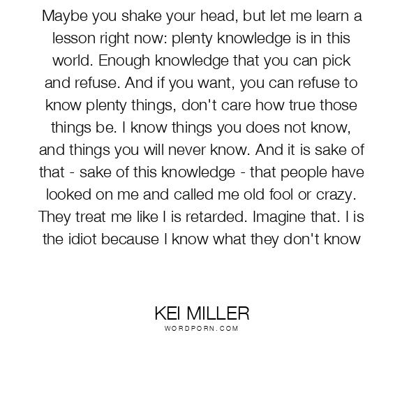 Maybe you shake your head, but let me learn a lesson right now: plenty knowledge is in this world. Enough knowledge that you can pick and refuse. And if you want, you can refuse to know plenty things, don't care how true those things be. I know things you does not know, and things you will never know. And it is sake of that - sake of this knowledge - that people have looked on me and called me old fool or crazy. They treat me like I is retarded. Imagine that. I is the idiot because I know what they don't know