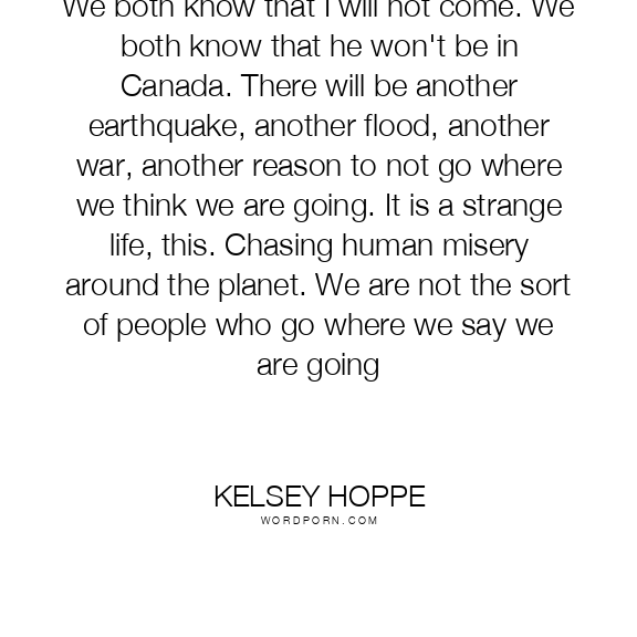 We both know that I will not come. We both know that he won't be in Canada. There will be another earthquake, another flood, another war, another reason to not go where we think we are going. It is a strange life, this. Chasing human misery around the planet. We are not the sort of people who go where we say we are going