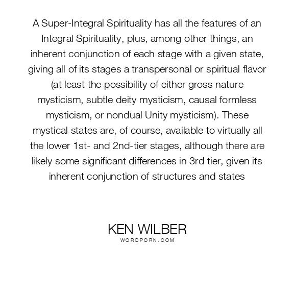 A Super-Integral Spirituality has all the features of an Integral Spirituality, plus, among other things, an inherent conjunction of each stage with a given state, giving all of its stages a transpersonal or spiritual flavor (at least the possibility of either gross nature mysticism, subtle deity mysticism, causal formless mysticism, or nondual Unity mysticism). These mystical states are, of course, available to virtually all the lower 1st- and 2nd-tier stages, although there are likely some significant differences in 3rd tier, given its inherent conjunction of structures and states