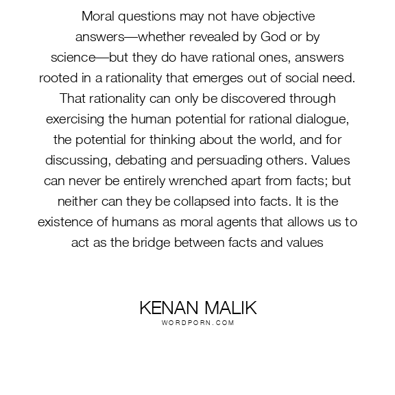 Moral questions may not have objective answers—whether revealed by God or by science—but they do have rational ones, answers rooted in a rationality that emerges out of social need. That rationality can only be discovered through exercising the human potential for rational dialogue, the potential for thinking about the world, and for discussing, debating and persuading others. Values can never be entirely wrenched apart from facts; but neither can they be collapsed into facts. It is the existence of humans as moral agents that allows us to act as the bridge between facts and values