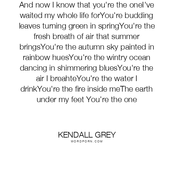 And now I know that you're the oneI've waited my whole life forYou're budding leaves turning green in springYou're the fresh breath of air that summer bringsYou're the autumn sky painted in rainbow huesYou're the wintry ocean dancing in shimmering bluesYou're the air I breahteYou're the water I drinkYou're the fire inside meThe earth under my feet You're the one