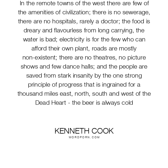 In the remote towns of the west there are few of the amenities of civilization; there is no sewerage, there are no hospitals, rarely a doctor; the food is dreary and flavourless from long carrying, the water is bad; electricity is for the few who can afford their own plant, roads are mostly non-existent; there are no theatres, no picture shows and few dance halls; and the people are saved from stark insanity by the one strong principle of progress that is ingrained for a thousand miles east, north, south and west of the Dead Heart - the beer is always cold