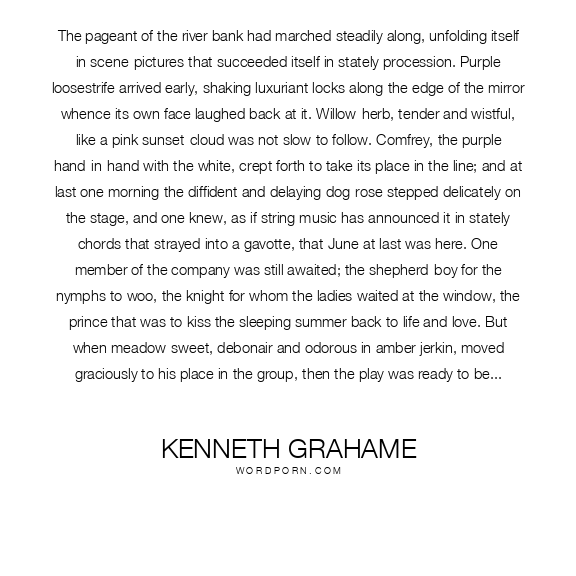 The pageant of the river bank had marched steadily along, unfolding itself in scene-pictures that succeeded itself in stately procession. Purple loosestrife arrived early, shaking luxuriant locks along the edge of the mirror whence its own face laughed back at it. Willow-herb, tender and wistful, like a pink sunset-cloud was not slow to follow. Comfrey, the purple hand-in-hand with the white, crept forth to take its place in the line; and at last one morning the diffident and delaying dog-rose stepped delicately on the stage, and one knew, as if string music has announced it in stately chords that strayed into a gavotte, that June at last was here. One member of the company was still awaited; the shepherd-boy for the nymphs to woo, the knight for whom the ladies waited at the window, the prince that was to kiss the sleeping summer back to life and love. But when meadow-sweet, debonair and odorous in amber jerkin, moved graciously to his place in the group, then the play was ready to begin