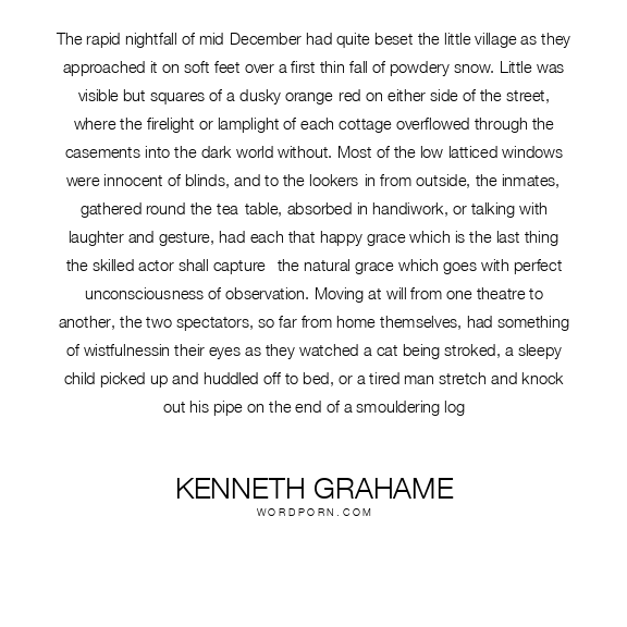The rapid nightfall of mid-December had quite beset the little village as they approached it on soft feet over a first thin fall of powdery snow. Little was visible but squares of a dusky orange-red on either side of the street, where the firelight or lamplight of each cottage overflowed through the casements into the dark world without. Most of the low latticed windows were innocent of blinds, and to the lookers-in from outside, the inmates, gathered round the tea-table, absorbed in handiwork, or talking with laughter and gesture, had each that happy grace which is the last thing the skilled actor shall capture--the natural grace which goes with perfect unconsciousness of observation. Moving at will from one theatre to another, the two spectators, so far from home themselves, had something of wistfulnessin their eyes as they watched a cat being stroked, a sleepy child picked up and huddled off to bed, or a tired man stretch and knock out his pipe on the end of a smouldering log