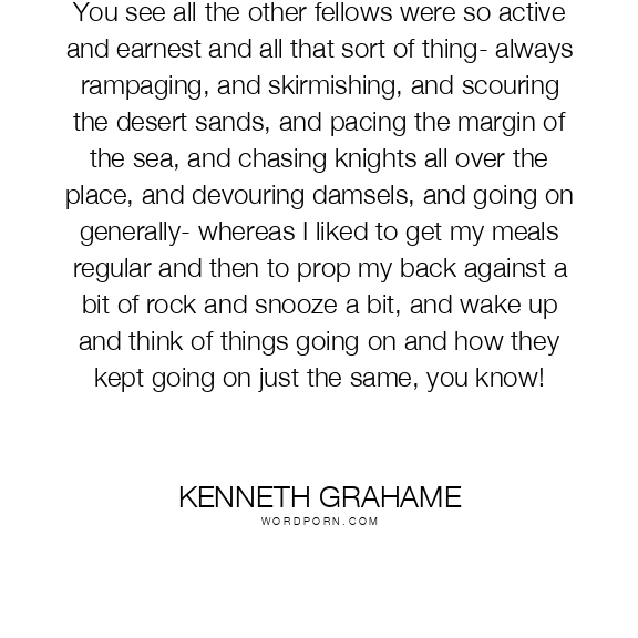 You see all the other fellows were so active and earnest and all that sort of thing- always rampaging, and skirmishing, and scouring the desert sands, and pacing the margin of the sea, and chasing knights all over the place, and devouring damsels, and going on generally- whereas I liked to get my meals regular and then to prop my back against a bit of rock and snooze a bit, and wake up and think of things going on and how they kept going on just the same, you know!