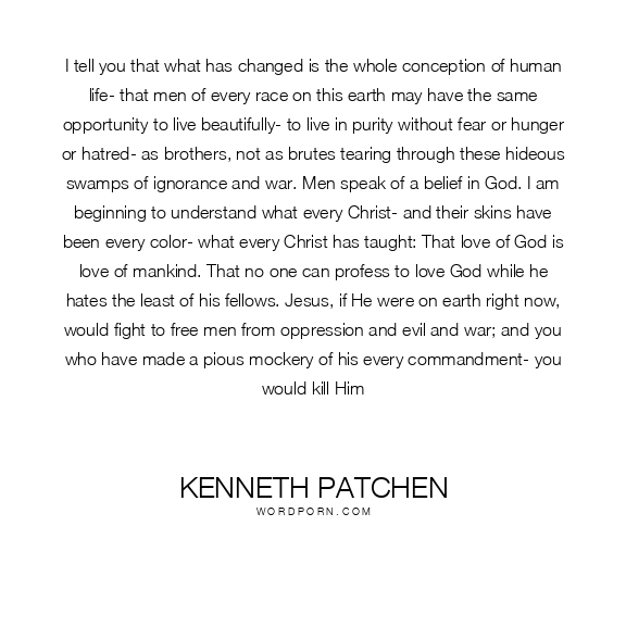 I tell you that what has changed is the whole conception of human life- that men of every race on this earth may have the same opportunity to live beautifully- to live in purity without fear or hunger or hatred- as brothers, not as brutes tearing through these hideous swamps of ignorance and war. Men speak of a belief in God. I am beginning to understand what every Christ- and their skins have been every color- what every Christ has taught: That love of God is love of mankind. That no one can profess to love God while he hates the least of his fellows. Jesus, if He were on earth right now, would fight to free men from oppression and evil and war; and you who have made a pious mockery of his every commandment- you would kill Him