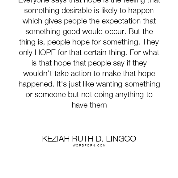 Everyone says that hope is the feeling that something desirable is likely to happen which gives people the expectation that something good would occur. But the thing is, people hope for something. They only HOPE for that certain thing. For what is that hope that people say if they wouldn't take action to make that hope happened. It's just like wanting something or someone but not doing anything to have them