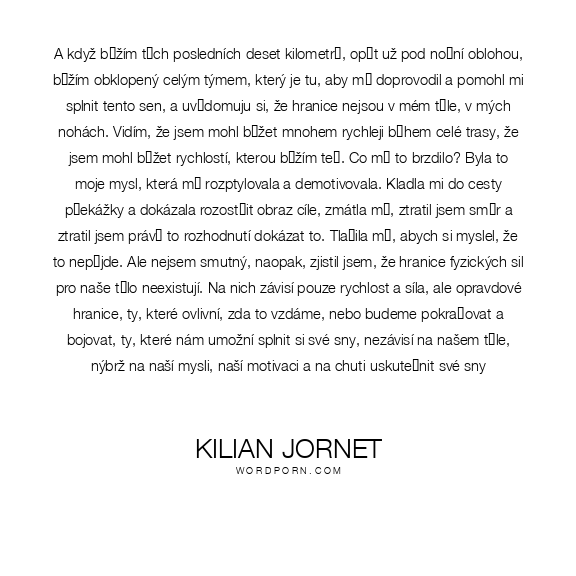 A když běžím těch posledních deset kilometrů, opět už pod noční oblohou, běžím obklopený celým týmem, který je tu, aby mě doprovodil a pomohl mi splnit tento sen, a uvědomuju si, že hranice nejsou v mém těle, v mých nohách. Vidím, že jsem mohl běžet mnohem rychleji během celé trasy, že jsem mohl běžet rychlostí, kterou běžím teď. Co mě to brzdilo? Byla to moje mysl, která mě rozptylovala a demotivovala. Kladla mi do cesty překážky a dokázala rozostřit obraz cíle, zmátla mě, ztratil jsem směr a ztratil jsem právě to rozhodnutí dokázat to. Tlačila mě, abych si myslel, že to nepůjde. Ale nejsem smutný, naopak, zjistil jsem, že hranice fyzických sil pro naše tělo neexistují. Na nich závisí pouze rychlost a síla, ale opravdové hranice, ty, které ovlivní, zda to vzdáme, nebo budeme pokračovat a bojovat, ty, které nám umožní splnit si své sny, nezávisí na našem těle, nýbrž na naší mysli, naší motivaci a na chuti uskutečnit své sny