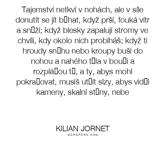 Tajemství netkví v nohách, ale v síle donutit se jít běhat, když prší, fouká vítr a sněží; když blesky zapalují stromy ve chvíli, kdy okolo nich probíháš; když ti hroudy sněhu nebo kroupy buší do nohou a nahého těla v bouři a rozpláčou tě, a ty, abys mohl pokračovat, musíš utřít slzy, abys viděl kameny, skalní stěny, nebe