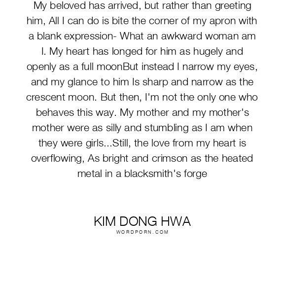My beloved has arrived, but rather than greeting him, All I can do is bite the corner of my apron with a blank expression- What an awkward woman am I. My heart has longed for him as hugely and openly as a full moonBut instead I narrow my eyes, and my glance to him Is sharp and narrow as the crescent moon. But then, I'm not the only one who behaves this way. My mother and my mother's mother were as silly and stumbling as I am when they were girls...Still, the love from my heart is overflowing, As bright and crimson as the heated metal in a blacksmith's forge