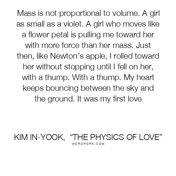 Mass is not proportional to volume. A girl as small as a violet. A girl who moves like a flower petal is pulling me toward her with more force than her mass. Just then, like Newton’s apple, I rolled toward her without stopping until I fell on her, with a thump. With a thump. My heart keeps bouncing between the sky and the ground. It was my first love