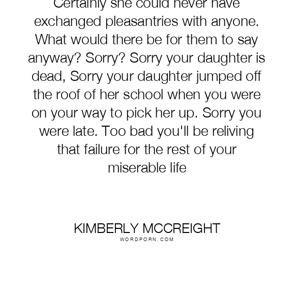 Certainly she could never have exchanged pleasantries with anyone. What would there be for them to say anyway? Sorry? Sorry your daughter is dead, Sorry your daughter jumped off the roof of her school when you were on your way to pick her up. Sorry you were late. Too bad you'll be reliving that failure for the rest of your miserable life