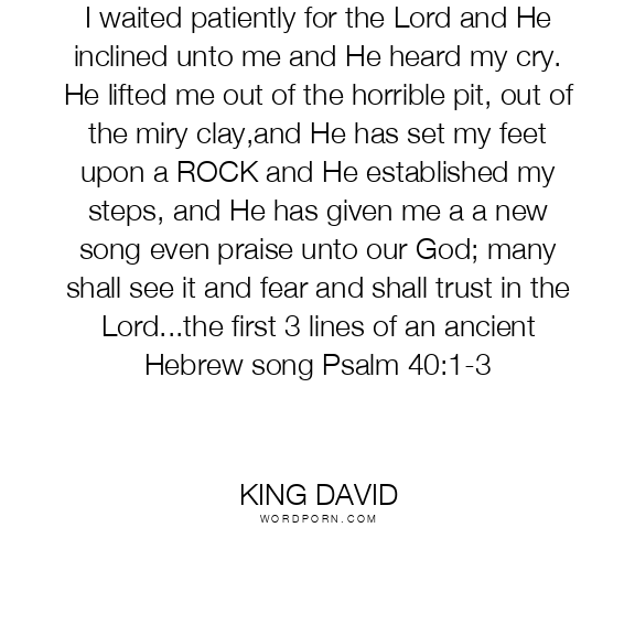 I waited patiently for the Lord and He inclined unto me and He heard my cry. He lifted me out of the horrible pit, out of the miry clay,and He has set my feet upon a ROCK and He established my steps, and He has given me a a new song even praise unto our God; many shall see it and fear and shall trust in the Lord...the first 3 lines of an ancient Hebrew song Psalm 40:1-3