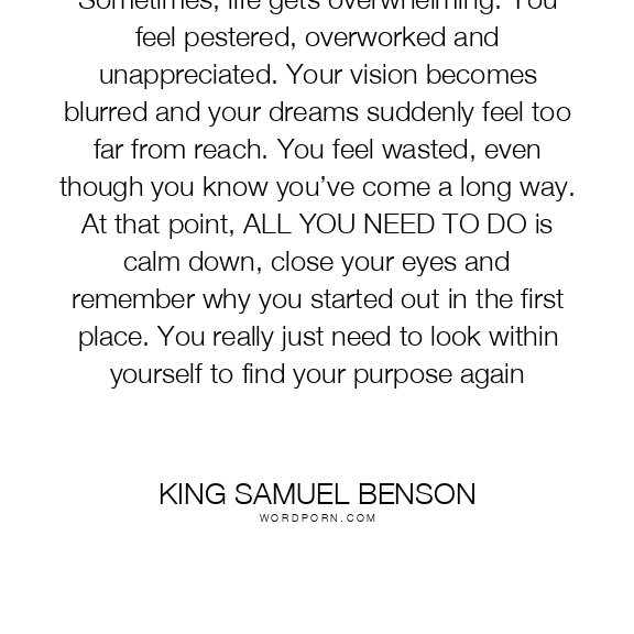 Sometimes, life gets overwhelming. You feel pestered, overworked and unappreciated. Your vision becomes blurred and your dreams suddenly feel too far from reach. You feel wasted, even though you know you’ve come a long way. At that point, ALL YOU NEED TO DO is calm down, close your eyes and remember why you started out in the first place. You really just need to look within yourself to find your purpose again