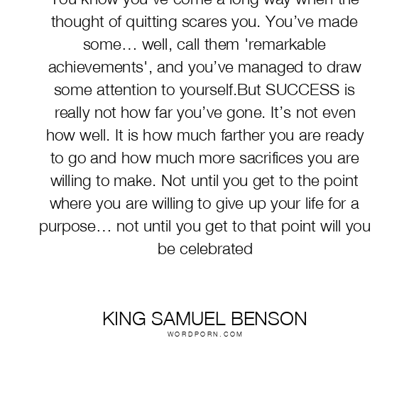You know you’ve come a long way when the thought of quitting scares you. You’ve made some… well, call them 'remarkable achievements', and you’ve managed to draw some attention to yourself.But SUCCESS is really not how far you’ve gone. It’s not even how well. It is how much farther you are ready to go and how much more sacrifices you are willing to make. Not until you get to the point where you are willing to give up your life for a purpose… not until you get to that point will you be celebrated