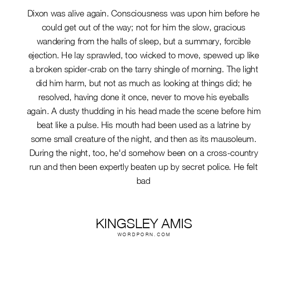 Kingsley Amis quote. Dixon was alive again. Consciousness was upon him before he could get out of the way; not for him the slow, gracious wandering from the halls of sleep, but a summary, forcible ejection. He lay sprawled, too wicked to move, spewed up like a broken spider-crab on the tarry shingle of morning. The light did him harm, but not as much as looking at things did; he resolved, having done it once, never to move his eyeballs again. A dusty thudding in his head made the scene before him beat like a pulse. His mouth had been used as a latrine by some small creature of the night, and then as its mausoleum. During the night, too, he'd somehow been on a cross-country run and then been expertly beaten up by secret police. He felt bad
