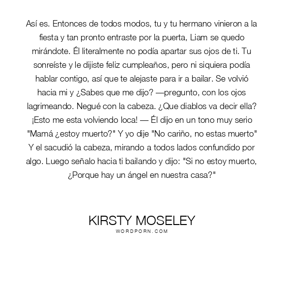 Kirsty Moseley quote. Así es. Entonces de todos modos, tu y tu hermano vinieron a la fiesta y tan pronto entraste por la puerta, Liam se quedo mirándote. Él literalmente no podía apartar sus ojos de ti. Tu sonreíste y le dijiste feliz cumpleaños, pero ni siquiera podía hablar contigo, así que te alejaste para ir a bailar. Se volvió hacia mi y ¿Sabes que me dijo? —pregunto, con los ojos lagrimeando. Negué con la cabeza. ¿Que diablos va decir ella? ¡Esto me esta volviendo loca! — Él dijo en un tono muy serio