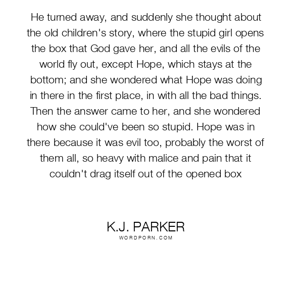 He turned away, and suddenly she thought about the old children's story, where the stupid girl opens the box that God gave her, and all the evils of the world fly out, except Hope, which stays at the bottom; and she wondered what Hope was doing in there in the first place, in with all the bad things. Then the answer came to her, and she wondered how she could've been so stupid. Hope was in there because it was evil too, probably the worst of them all, so heavy with malice and pain that it couldn't drag itself out of the opened box